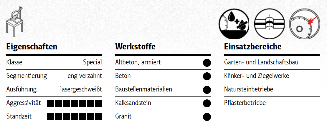 Die Herstellung der Diamanttrennscheibe DT 900 US Special erfolgt mit einer speziellen Segmentbildung. Mit seinem aggressiven Schleifverhalten gewährleistet das Werkzeug hohe Standzeiten für einen sauberen Schnitt während der gesamten Bearbeitungszeit. Eine weitere Besonderheit ist der Sandwich Leisekern. Dieser spezielle Aufbau sorgt für geräuschreduziertes Arbeiten. Damit trägt die Trennscheibe zum Arbeitsschutz während der Bearbeitung von Baustellenmaterialien bei und verringert gleichzeitig die Lärmbelastung in der direkten Umgebung des Einsatzortes.